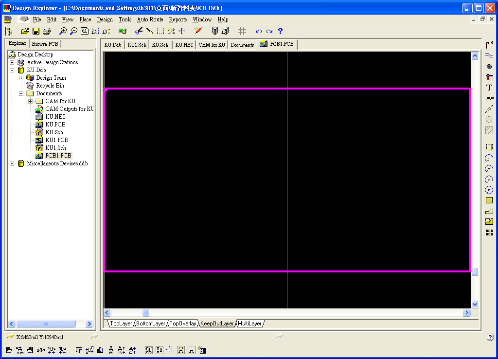 雙擊新命名之PCB檔,進(jìn)入PCB布線畫面,先點(diǎn)選畫面下方之KeepOutLayer頁面標(biāo)籤,再用畫面右側(cè)之繪圖線畫出邊框線,如圖14。畫面一樣用PageUp或PageDown調(diào)整至適合大小做繪圖。